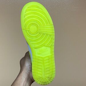 Vibrant Jordan 1 mid sneakers with volt green and university blue accents. The letter I on the text “Air” has rubbed off a little on the right pair other than that they are in good condition.