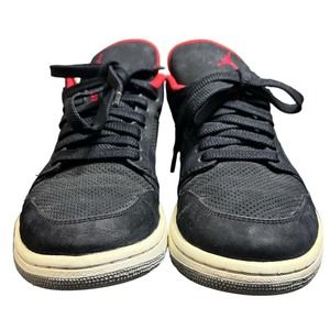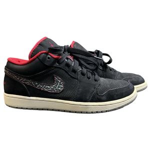 Elevate your sneaker game with these stylish Jordan 1 Low Red sneakers. With a classic lace-up closure and a low-top silhouette, these shoes are perfect for casual occasions and walking. The solid black suede upper and rubber outsole provide durability and comfort, while the fabric lining and insole ensure a snug fit.