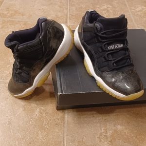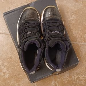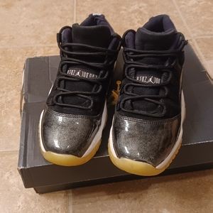 Authentic preowned Air Jordan 11 Retro Low GS 'Barons' 528896 010 black/metallic silver/white. Unisex youth size 5 also fits women's size 6½. Low top lace ups with black suede uppers, the signature patent leather wraparound and a translucent outsole. See all signs of wear as shown in pictures. Note the left toe box- slight sole separation and a little peel back of the patent lining. No other damage. No odors. No box. Cleaned and disinfected. Smoke and pet free home. Currently valued over $500 new. Reasonable offers accepted. Carefully packaged and immediately shipped.