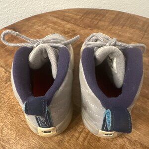 Give your little one a stylish start with these Air Jordan 12 Retro Shoes in University Blue Wolf Gray. Designed for comfort and durability, these sneakers feature a premium gray leather upper with striking University Blue accents. The classic '23' on the heel and the Jumpman logo on the tongue add a touch of basketball heritage. Perfect for everyday wear or special occasions, these shoes will keep your toddler looking cool and feeling comfortable. Grab a pair today and let your child step out in style!