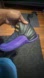 Bold Jordan sneakers with a striking black and purple colorway. Features gold accents for a unique touch.