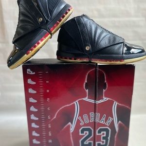 Designed by Nike Senior Footwear designer Wilson Smith, the Air Jordan 16 debuted in 2001 and was the first signature Air Jordan sneaker after the Air Jordan 3 to not be designed by Tinker Hatfield. The Jordan 16 borrows several design cues from previous Jordans which include the patent leather from the Air Jordan 11 and the clear outsole from the Air Jordan 5. A first for the Jordan line, the 16 introduced a gaiter which served both aesthetic and performance purposes.