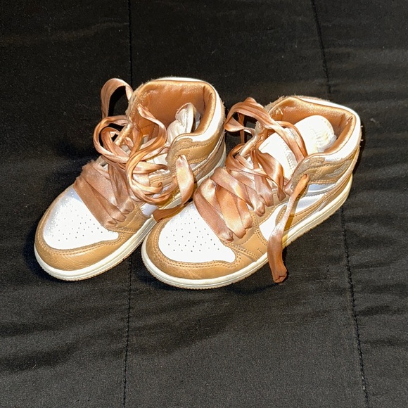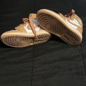 Stylish Jordan sneakers for kids. Features a white and tan color scheme. Comfortable and trendy design.