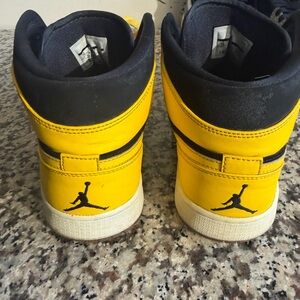 Stylish Jordan sneakers. Bold yellow and black design. Iconic logo on tongue.
