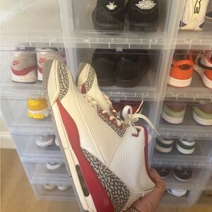 Classic Jordan sneakers with a bold red and white design. Lightly worn with a minor stain on one shoe lace