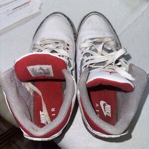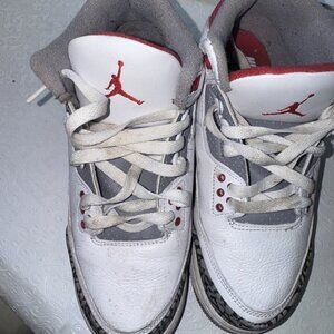 The product is a pair of Jordan 3 Retro Mid Fire Red sneakers in size 7Y, designed for children/teens. These low top sneakers feature a classic white color with a retro theme, part of the Air Jordan product line. With a US shoe size of 7 and UK shoe size of 6, these athletic shoes are a stylish and trendy addition to any sneaker collection. Made in Indonesia, these Jordan 3s offer both comfort and style for everyday wear or athletic activities.