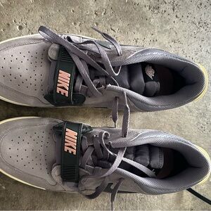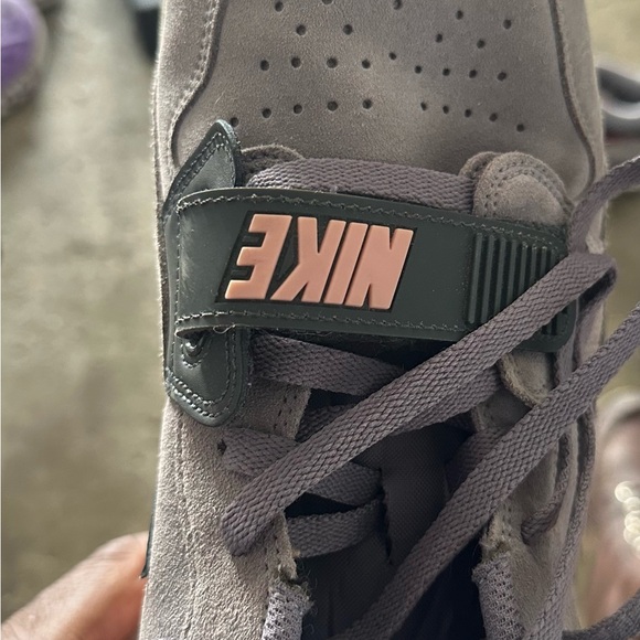 Stylish Nike Jordan athletic shoes. Features gray suede with pink accents. Perfect for sports and casual wear.