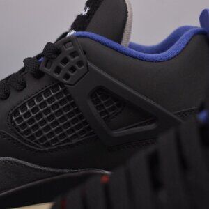 The Air Jordan 4 Retro 'Rare Air' features a black nubuck upper with quarter panel mesh, plastic support wings, and red and black molded eyelets.