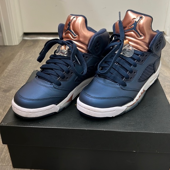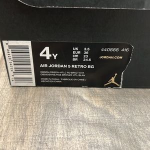 Jordan 5 bronze and obsidienne in excellent condition. Wore them max of 5 time. They are too tight on me. Size 4 youth which would fit about 5.5-6 woman’s.
