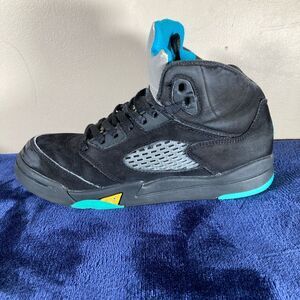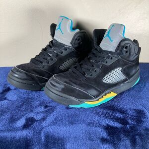 Really nice pair of Jordan 5 Retro GS “Aqua” size 2Y. Nike 440889-047. There is some toe rub as seen in photos, but otherwise these are in great shape! Soles are excellent and ready for lots of wear!