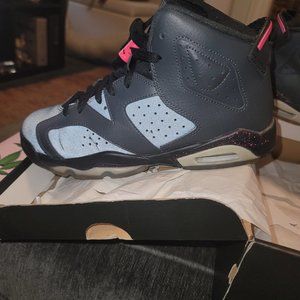 A grade-school shoe, the Air Jordan 6 Retro GS 'Hyper Pink' features an Anthracite and black upper with 3M reflective detailing throughout. The subtly flashy look is accented by vibrant hits of Hyper Pink on the lace lock and heel pull-tab, with more pink on the midsole speckling. Visible Air provides cushioning, with icy translucent inserts on the outsole. USED