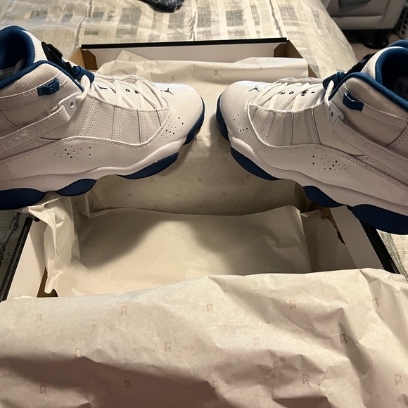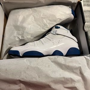 The Men’s Jordan 6 Rings is a classic hybrid sneaker that combines all six of the Air Jordan models Michael Jordan wore en route to his six championships. The unique design combines elements of the Air Jordan 6, Air Jordan 7, and Air Jordan 8 from his first three-peat from 1991-93; and the Air Jordan 11, Air Jordan 12, and Air Jordan 13 from the second set of consecutive championships from 1996-98. The most pronounced details from the six iconic models include the sole unit of the AJ 13, the patent leather mudguard of the AJ 11, the straps and chenille Jumpman tongue patch of the AJ 8, and the rear “spoiler” heel tab of the AJ 6. Smaller details call out the AJ 7 and AJ 12, with the perforated detailing and “TWO3” text running down the tongue, respectively. All these details combine to form a fresh silhouette that still retains the iconic style of the originals.