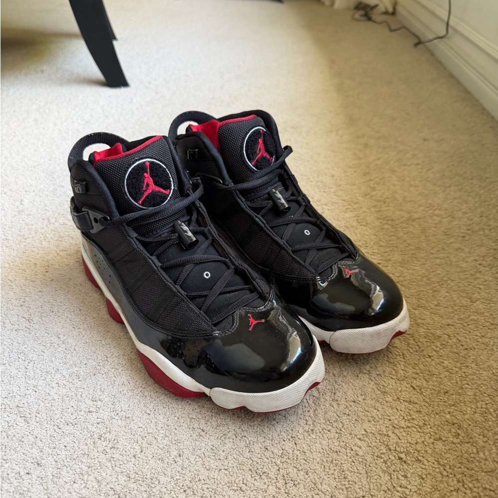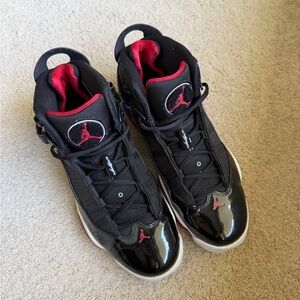 Classic Jordan high-top design. Black mesh and patent leather upper with red accents. White midsole and red outsole detailing. Jumpman logo on tongue and toe. Sporty and collectible silhouette. Men’s 9.5 / 43