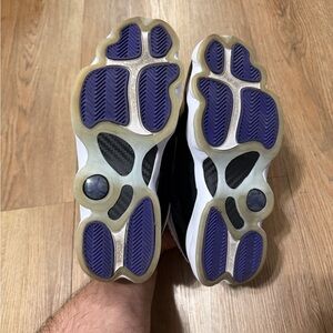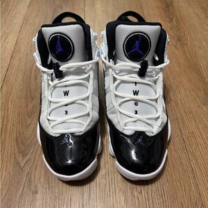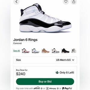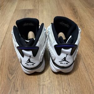 Men’s Jordan 6 Rings Concord, size 8.5. These are black/white in color with the patent leather (similar to the Jordan 11’s). There is a purple jump-man accent on the tongue of the shoe and on the heal grip. These have been worn maybe 2 times and have anyways been well maintained. They do not come with the original box. I have included a screen shot of the price they currently go for (new) on Stock X. The fact that they have been worn and do not come with the original box have been considered and factored in the pricing. Like new, no scuffs, and stored in a smoke free home.
