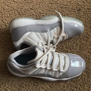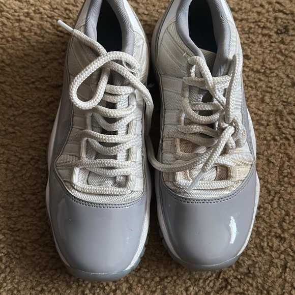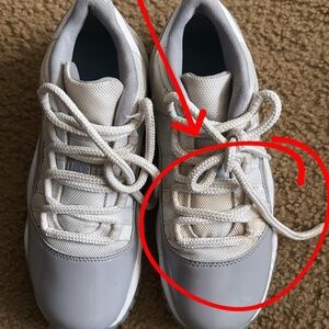 Stylish white and gray sneakers with a sleek design. Perfect for casual wear. STAIN ON SHOE 4y