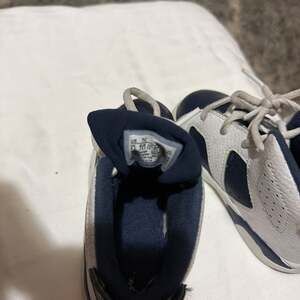Jordan toddler shoes in a classic white and navy colorway, size 7C. These iconic sneakers feature the Jumpman logo in red on the heel and tongue. Perfect for little ones to sport a stylish look. Excellent pre-owned condition with minor signs of wear consistent with toddler shoes.