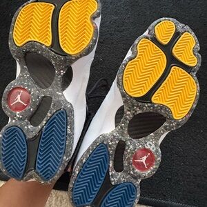 Black and white, red/blue/yellow embroidered on front tongue, pink behind tongue and at back ankle. Splatter look bottoms. Super clean and nice.
