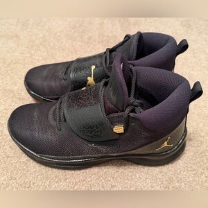 Triple black Jordan model with gold accents.