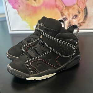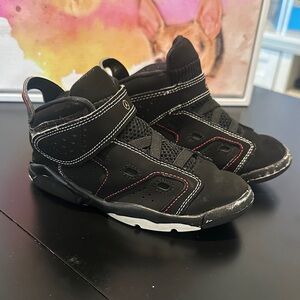 Sleek black sneakers with red accents. Durable and stylish for kids.