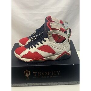 The product is a pre-owned pair of Jordan 7 Retro Trophy Room sneakers in a size 8. These iconic athletic shoes feature a multicolor design, embodying the retro theme of the Air Jordan 7 model. With the brand's reputation for quality and style, these sneakers are sure to make a statement for any man looking to add a touch of sporty flair to their outfit.