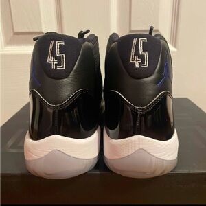 Sleek Jordan Air 11 Retro sneakers. Black with concord highlights. Iconic style for any occasion.