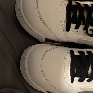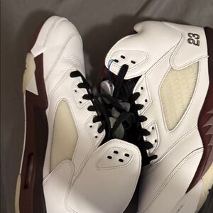 The A Ma Maniere x Air Jordan 5 Retro OG "Black Collective" is a white leather sneaker with a quilted burgundy interior, featuring A Ma Maniere's "A" logo on one tongue and Michael Jordan's signature on the other. The shoe includes a pre-yellowed mesh, burgundy "shark teeth" on the midsole, an aged translucent rubber outsole, and Nike Air branding on the heel. It is part of a collection celebrating Black heritage and culture, using cotton laces from the Seed2Shirt Black Collective, a Black-owned apparel supply chain.