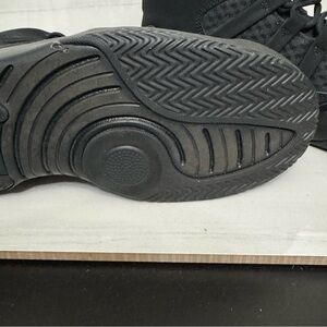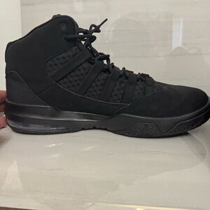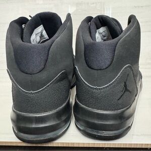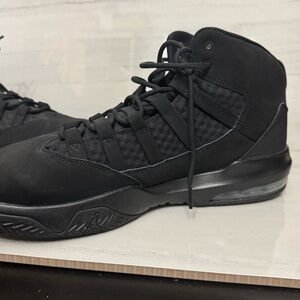 Experience the perfect blend of style and support with these Jordan sneakers. Featuring a sleek all-black design, they boast a mesh and synthetic upper for breathability and a mid-height ankle collar for added stability. The solid black rubber outsole ensures durability and traction, making them ideal for both athletic activities and casual wear. Like new condition