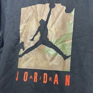 This stylish black Jordan sweater features a prominent square graphic on the front, highlighted by the iconic Jumpman logo. The bold 'JORDAN' text in bright orange adds a vibrant touch, making it a standout piece for any casual occasion. With its comfortable hooded design, this sweater effortlessly combines fashion and functionality.