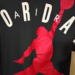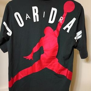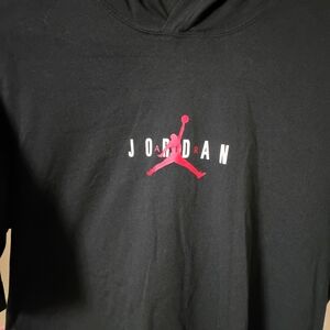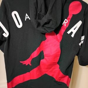 The product is a men's small black short sleeve full graphic Air Jordan hoodie shirt featuring the iconic Jumpman logo. Made of cotton fleece material, this hooded short sleeve tee is part of the Nike Air product line and is machine washable. The regular fit shirt is perfect for the 90s sports theme, ideal for the summer and spring seasons. Designed with the Michael Jordan character in mind, this hoodie shirt is a stylish and comfortable addition to any man's wardrobe.