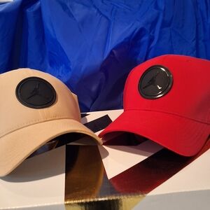 Nike jacket in vibrant blue with white accents. Features iconic logo. Includes red and tan caps with black logo patches.