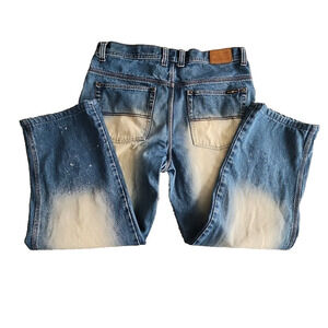 These Jordan Craig Jeans in a men’s size 36x32 are a standout piece for any wardrobe. The medium blue wash is complemented by a unique distressed look, featuring a splatter pattern that adds a touch of individuality to the jeans. The wide leg and bootcut design ensure a comfortable fit, making these jeans perfect for casual wear or dressing up with a stylish pair of boots. The image provided showcases the jeans laid flat, highlighting the distinctive faded areas on the thighs and the overall relaxed fit.