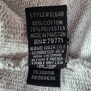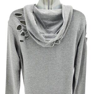 Pullover style long sleeve hooded sweatshirt - shade of heather gray. Decorative rips / shredding all over. Raw hem edges. 1 Front kangaroo pocket pouch. Cotton & Polyester blend. Made in Pakistan.