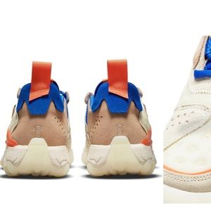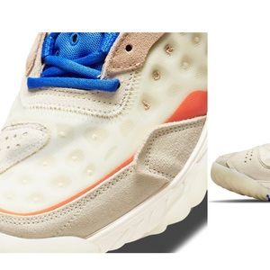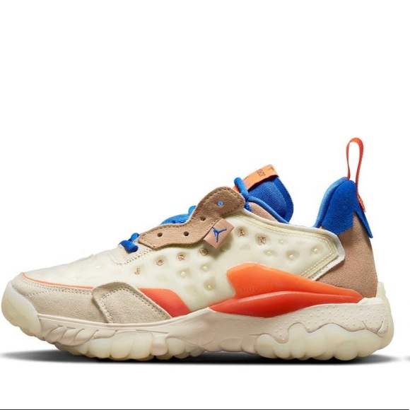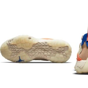 A controlled chaos of space-age materials and grounded layers energizes the new-generation Jordan Delta that still sports its amplified curves and proportions. Debossed Jordan embroidery puckers along the sides to emphasize the dimensional exaggerations, while springy Nike React foam and rippled rubber pods ground every step with vertical cushioning, lateral stability and sneakerhead excitement.