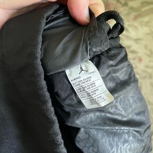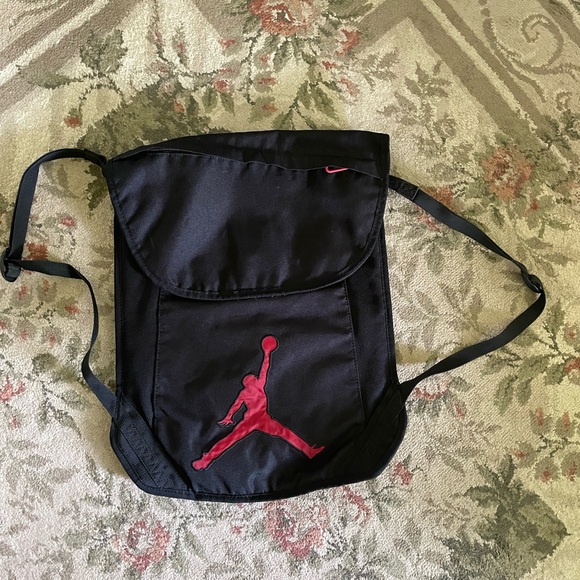 Jordan black and red drawstring pack pack. Lining is black print and bag has red zipper pulls on pockets. Great used condition.