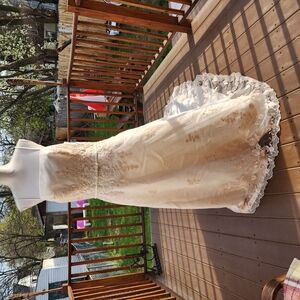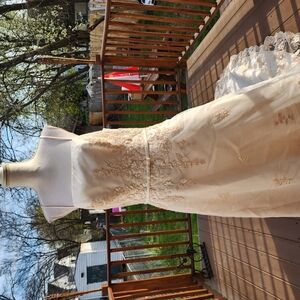 Stunning cream gown with delicate pink floral details. Perfect for special occasions.