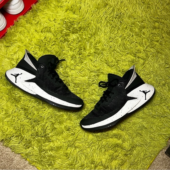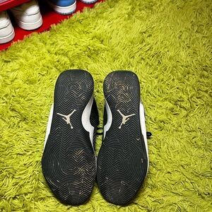 Stylish Jordan sneakers. Black and white design. Perfect for casual wear. Honestly looks similar to a carbon fiber material 🤷🏽♂️ imo. Hardly used lots of life.