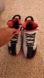 Eye-catching Jordan high-tops with a striking red, black, and white color scheme. Ideal for making a statement.