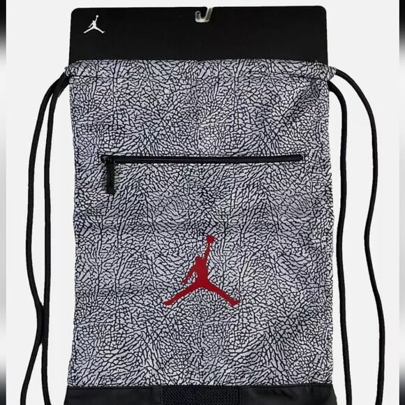 Stylish and functional Jordan drawstring bag in black and gray. Perfect for carrying essentials with ease.