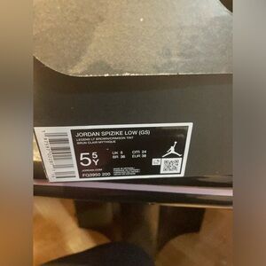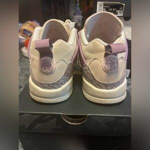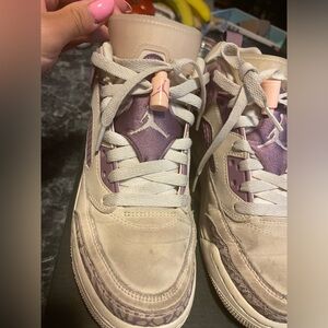Stylish Jordan kids shoes. Features purple accents. Cream base with unique design. Size 5.5y