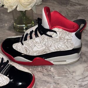 Stylish Jordan dub zero sneakers for kids. Features bold red, black, and white design. Comfortable and trendy.. My daughter only got to wear these twice before it got hot out and she grew out of them. See pictures>>>there are a few scuffs on the black patent leather part that’s hardly noticeable.