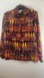 Bold blouse with shoe pattern. Features red, yellow, and green hues.
