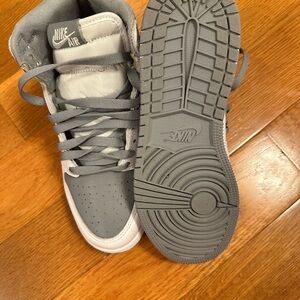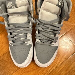 Nike Air Jordan high-top sneakers with a sleek gray and white design. Big kid size 5. Good condition, no box. Missing white shoe strings. Pictures does no justice, we are sneakers heads and take good care of our sneakers.