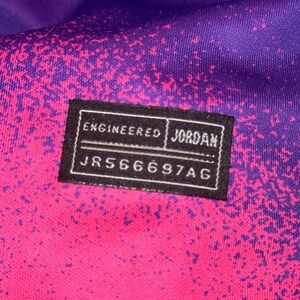 This Jordan jersey showcases a captivating blend of purple and pink in a fluid gradient pattern, perfect for making a bold statement. Designed with a sleek black V-neck collar and sleeve trim, it combines style with functionality. The lightweight, breathable fabric ensures comfort during any activity.
