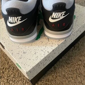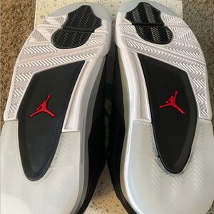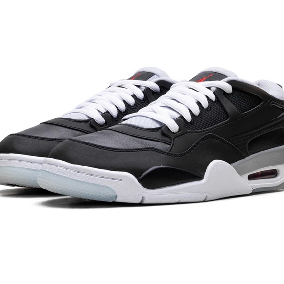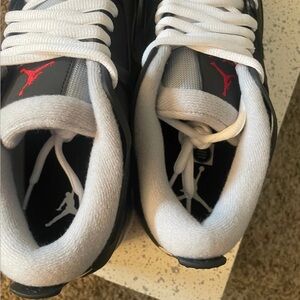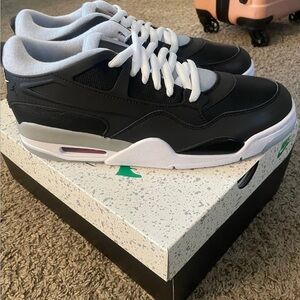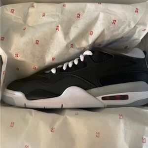 Experience the perfect blend of style and comfort with these Jordan sneakers, featuring a sleek black upper contrasted by a white midsole. The low-top design and visible air cushion in the heel offer both a retro aesthetic and enhanced impact absorption, making them ideal for casual wear or light athletic activities. New and unworn in OG box.