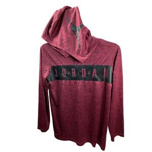 Jordan red hooded sweatshirt — bold black “JORDAN” print across chest Youth Large — athletic cut with Dri-FIT moisture-wicking fabric Lightweight and breathable — ideal for active wear, school, or casual street style Includes full views, close-ups of logo, tag, and ruler measurements Tag shows Dri-FIT branding — see photos for full details and sizing