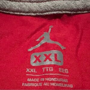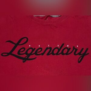 Vibrant red tee with black 'Legendary' script. Classic Jordan logo detail. This is a red Nike Jordan "Become Legendary" t-shirt with a black script logo and a white Jumpman logo.