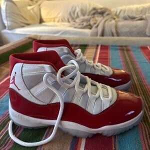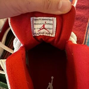 Step into style with these Jordan sneakers, showcasing a striking cherry red upper with a sleek, glossy finish. The contrasting white accents, including the laces and midsole, add a fresh touch to the sporty, basketball-inspired design. Perfect for making a bold statement, these low-top sneakers are a must-have for any sneaker enthusiast.