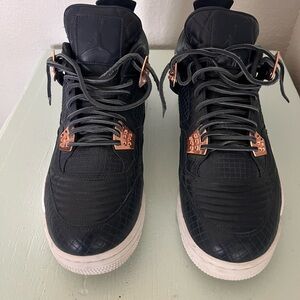 Stylish Air Jordan Retro 4s with a navy blue pattern and a bronze-plaited touch. Perfect for casual outings and adding a trendy touch to your outfit.