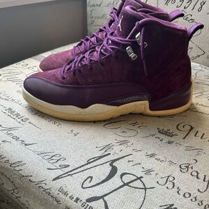 Jordan Retro 12 sneakers in deep burgundy. Cream accents and classic design. Iconic branding on heel.