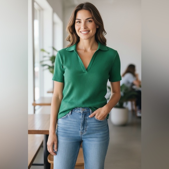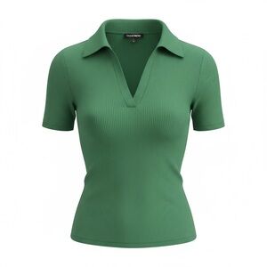 Fashion Nova Jordan Ribbed Collared Top in Green, Size Medium - Brand New with Tags. This stylish short-sleeve top features a textured rib-knit material and a classic polo-style collar with a deep V-neckline. Perfect for a casual streetwear look or pairing with high-waisted denim. The vibrant green color makes it a standout piece for any season. New with tags, pristine condition